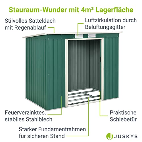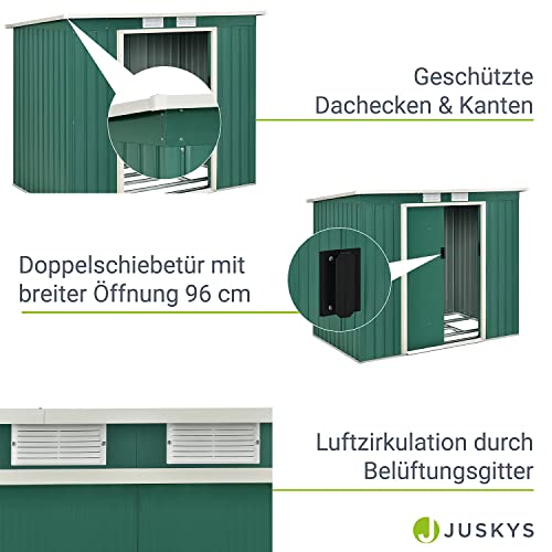 Bien protégé; Abri à outils robuste avec toit en pente vert foncé en tôle d’acier galvanisée à chaud ; résiste aux intempéries, aux rayons UV et à la saleté ; Durable, stable, résistant et étanche