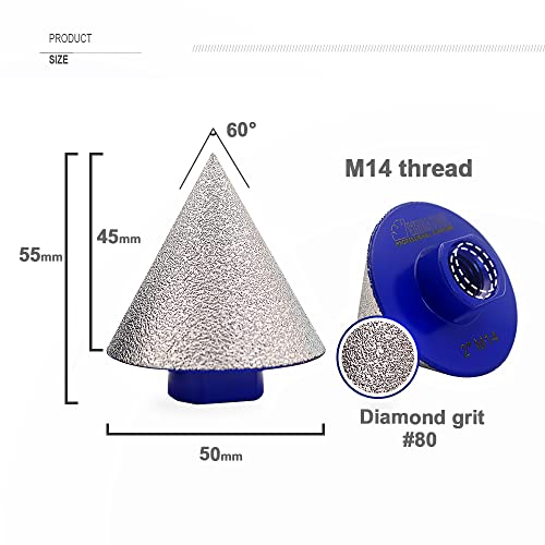 Tige : filetage M14, angle de chanfrein : angle supérieur 60 degrés, diamètre du chanfrein : 50 mm, longueur totale : 55 mm, profondeur de fonctionnement : 46 mm, grain : #80